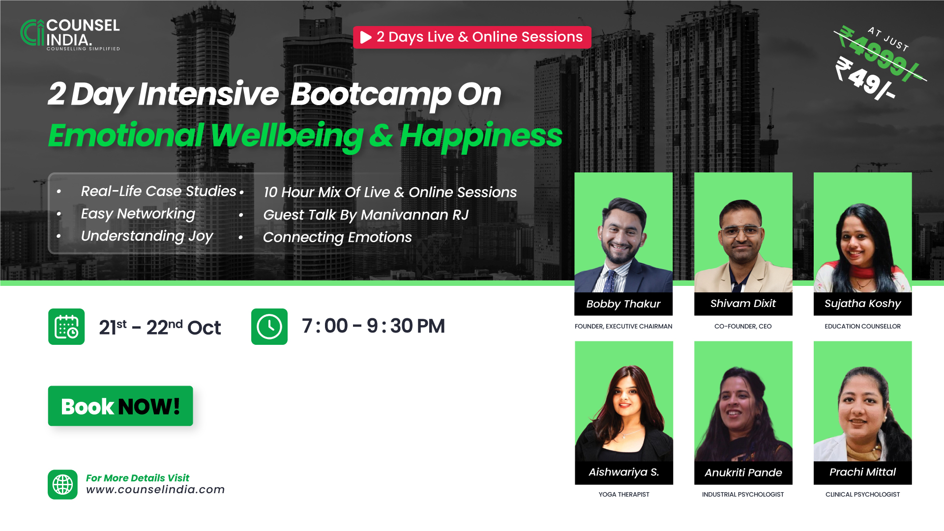 Counsel India is thrilled to announce its 2 day intensive Bootcamp on Emotional Well being and Happiness, with our professional experts, and trained mentors.