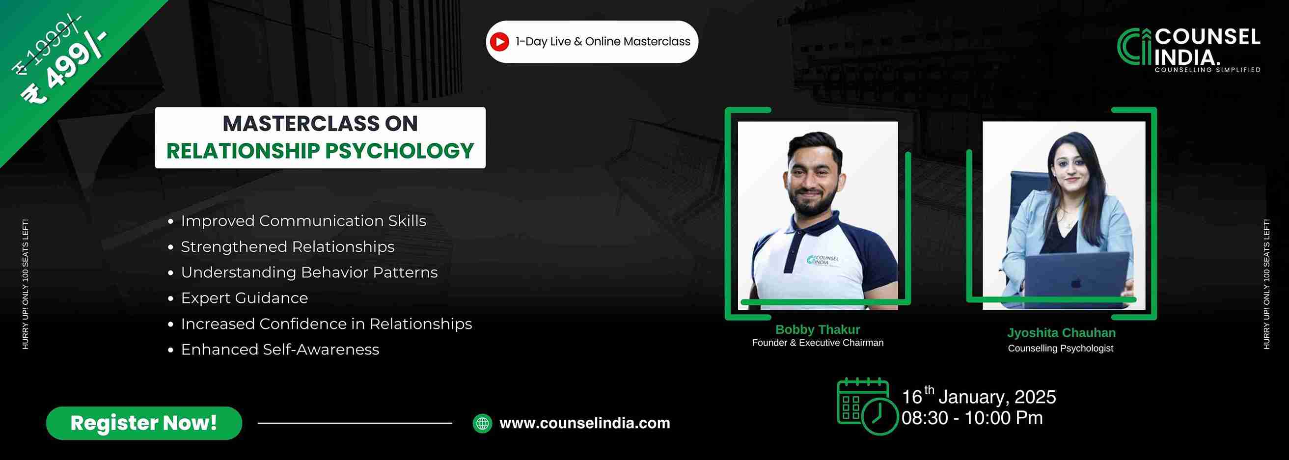 Welcome to Counsel India's exclusive, online “1 Day Masterclass on Relationship Psychology"! In this 1-day intensive immersion masterclass, we invite you to indulge in interactive learning about on how to build stronger, healthier connections with the people in your life. This masterclass focuses on understanding emotions, improving communication, and creating meaningful relationships. It is perfect for anyone looking to grow personally or help others do the same.