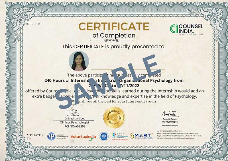 - Counsel India is authorized/recognised by well-known government bodies like MCA, NSDC, WFMH, ISO, SMART, Member of APA and Startup India. Your certificates will have mention of these recognitions validating the authenticity of your credentials.
