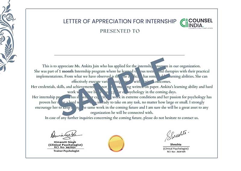 Special features of this program include Counselling Procedure Class, case study discussions, Lifetime access to a psychology E-library (5000+ books), and volunteer participation in mental health awareness campaigns. Needless to say, this program also offers self-branding and marketing sessions and participants shall get job vacancy information every 30 days. A smart way to become an expert in counselling is right here, at Counsel India.